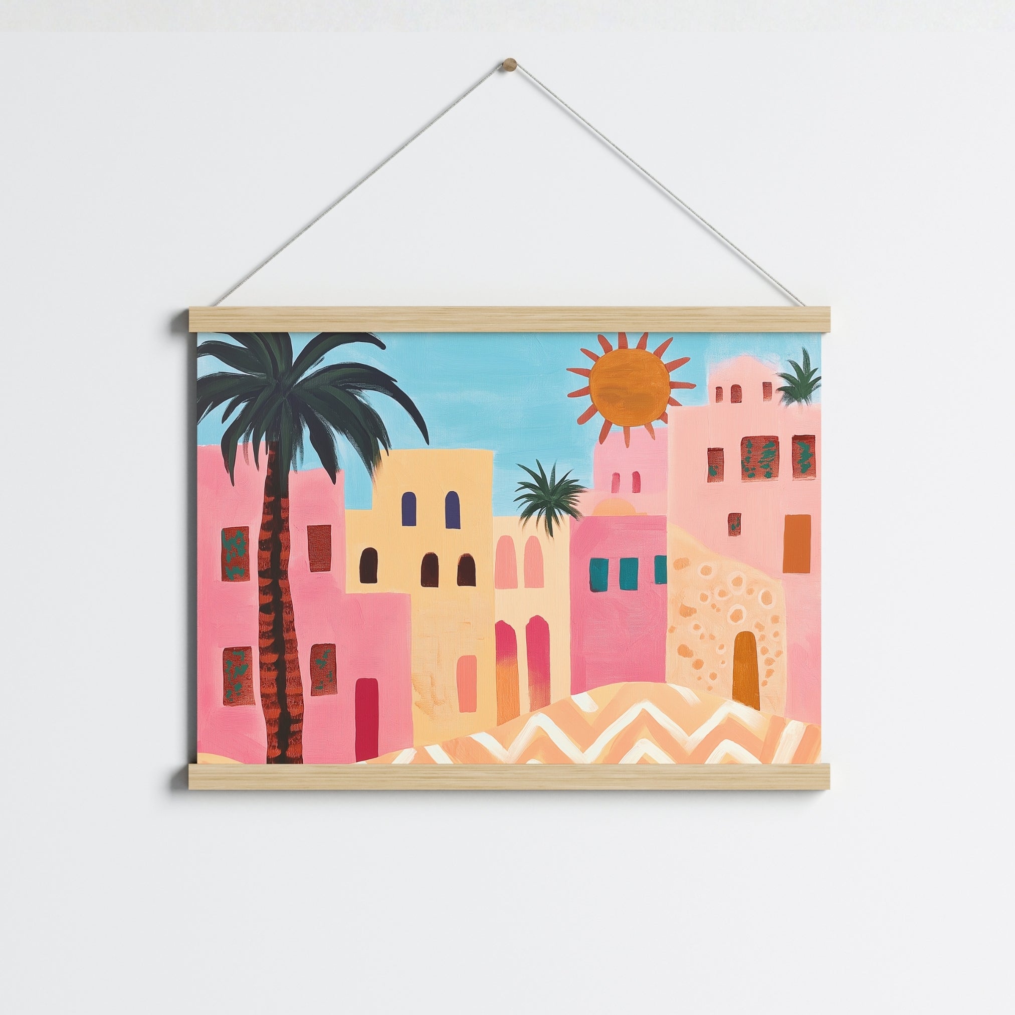 Printed on premium 200 gsm semi-gloss paper for soft yet vibrant tones and sharp details. Delivered with a minimalist wooden magnetic hanger, available in natural, white, or black finishes. Lightweight, modern, and ready to hang instantly — no frame needed.