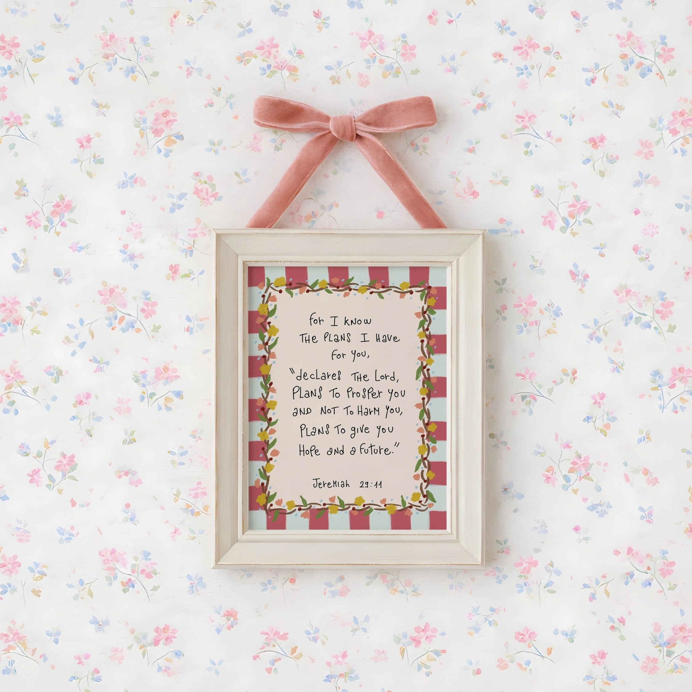 Transformez votre espace en un sanctuaire doux et empreint de foi grâce à nos illustrations murales chrétiennes réalisées à la main, dans un style printanier délicat et coquet.