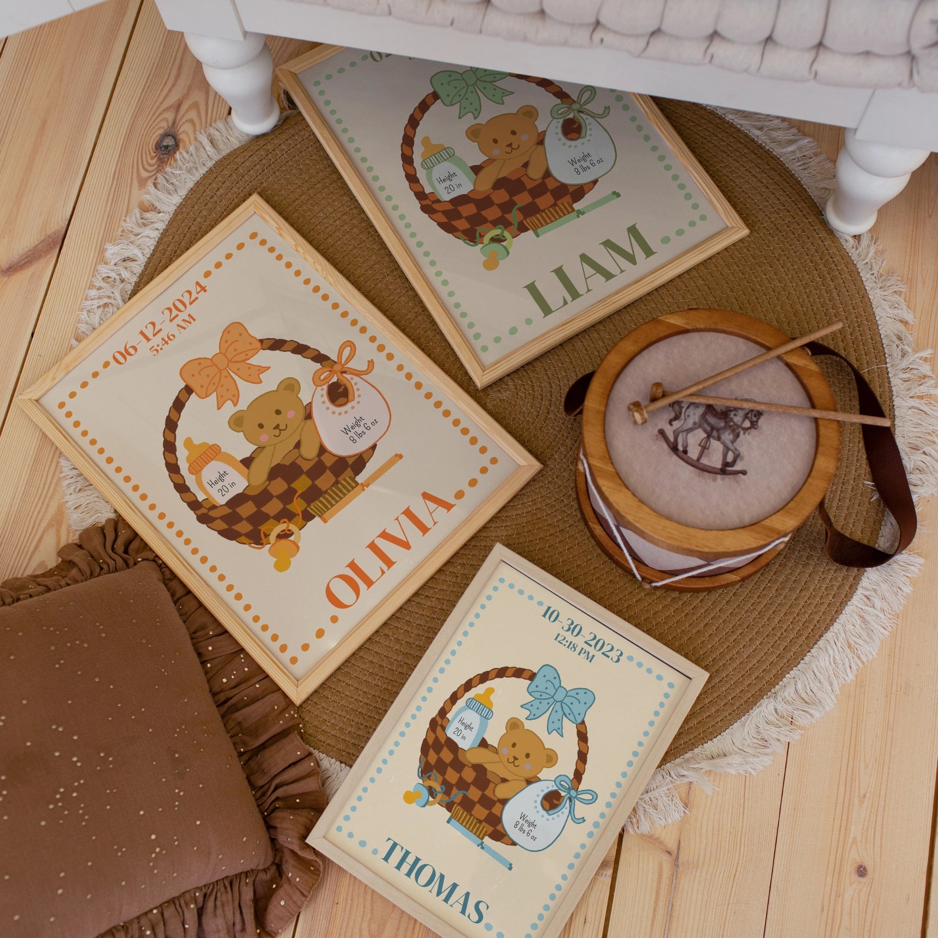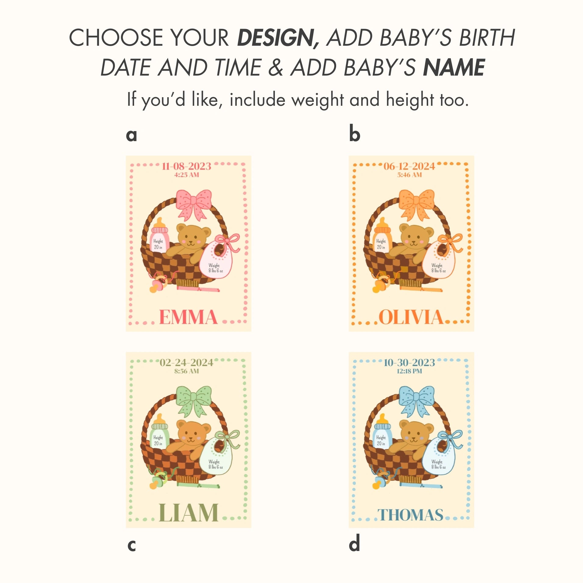Choisissez le motif qui vous plaît, sélectionnez le format d'impression , ajoutez le nom, indiquez la date et l'heure de naissance , et précisez si vous souhaitez inclure le poids et la taille du bébé. Idéale pour la chambre de bébé et l'espace enfant, cette adorable décoration murale est une façon tendre de célébrer votre petit ange.
