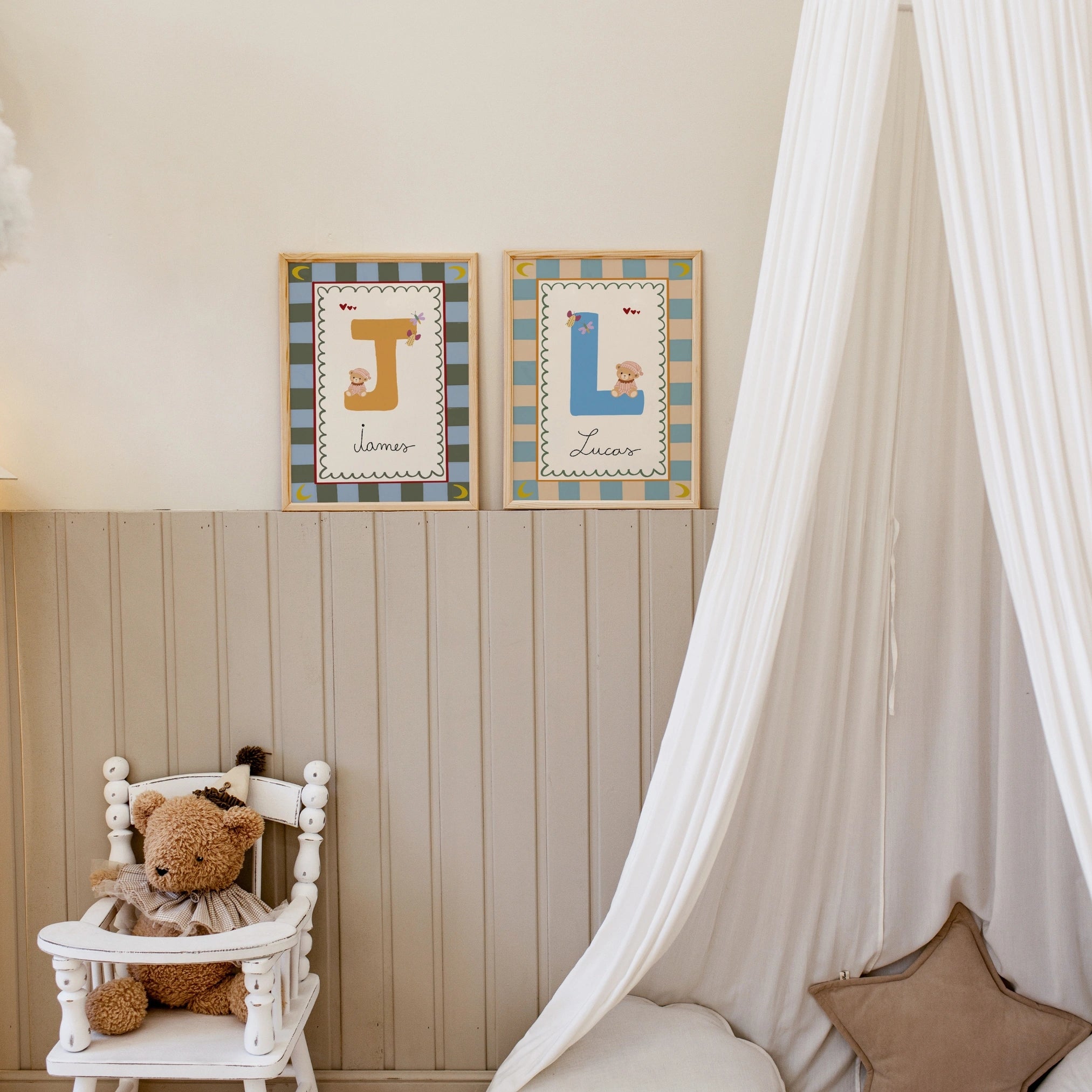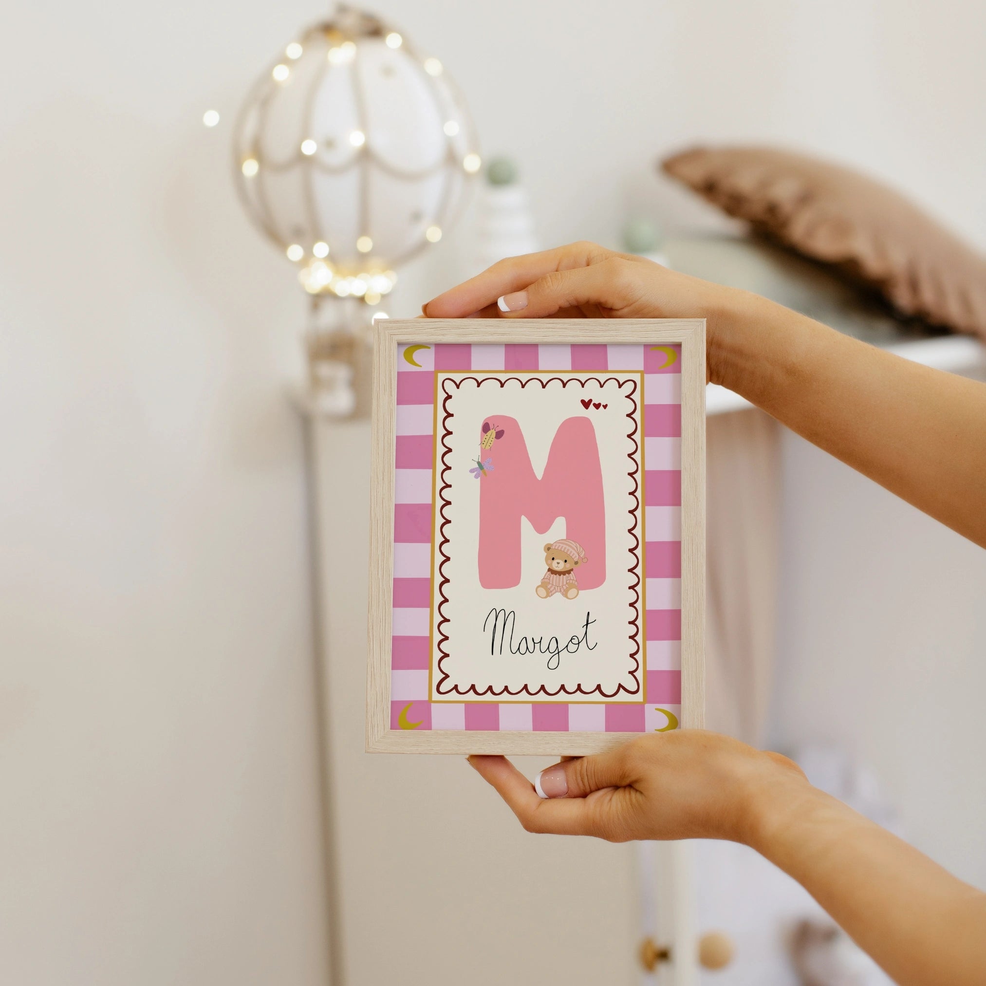 Choisissez le motif qui vous plaît, sélectionnez le format d'impression et ajoutez le nom que vous souhaitez inclure. Idéale pour les chambres de bébé et d'enfants, cette adorable décoration murale est une façon tendre de célébrer votre tout-petit.