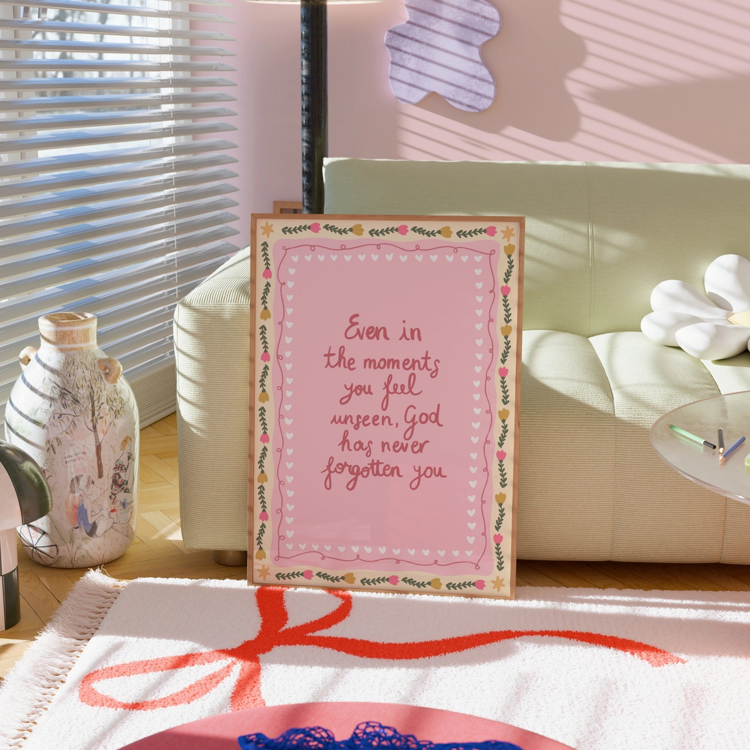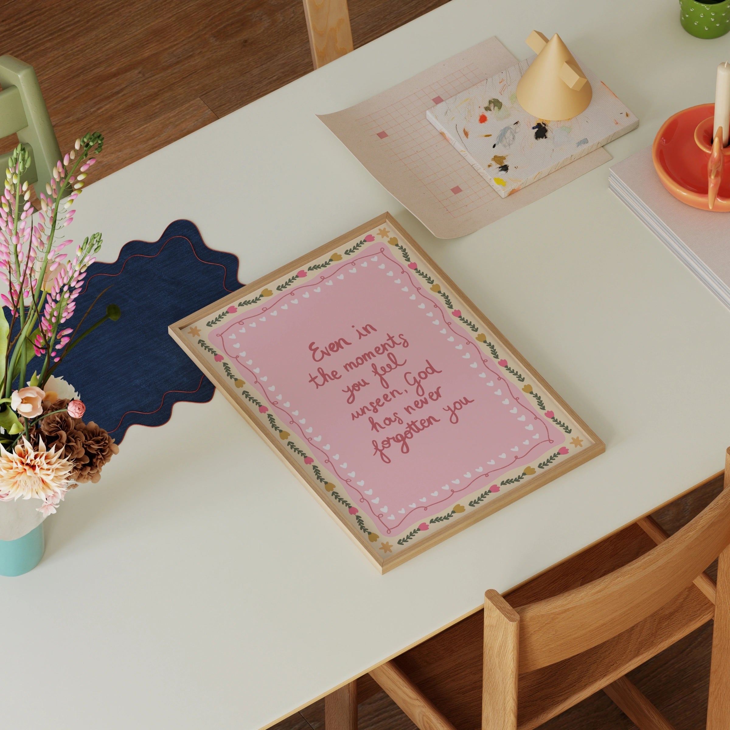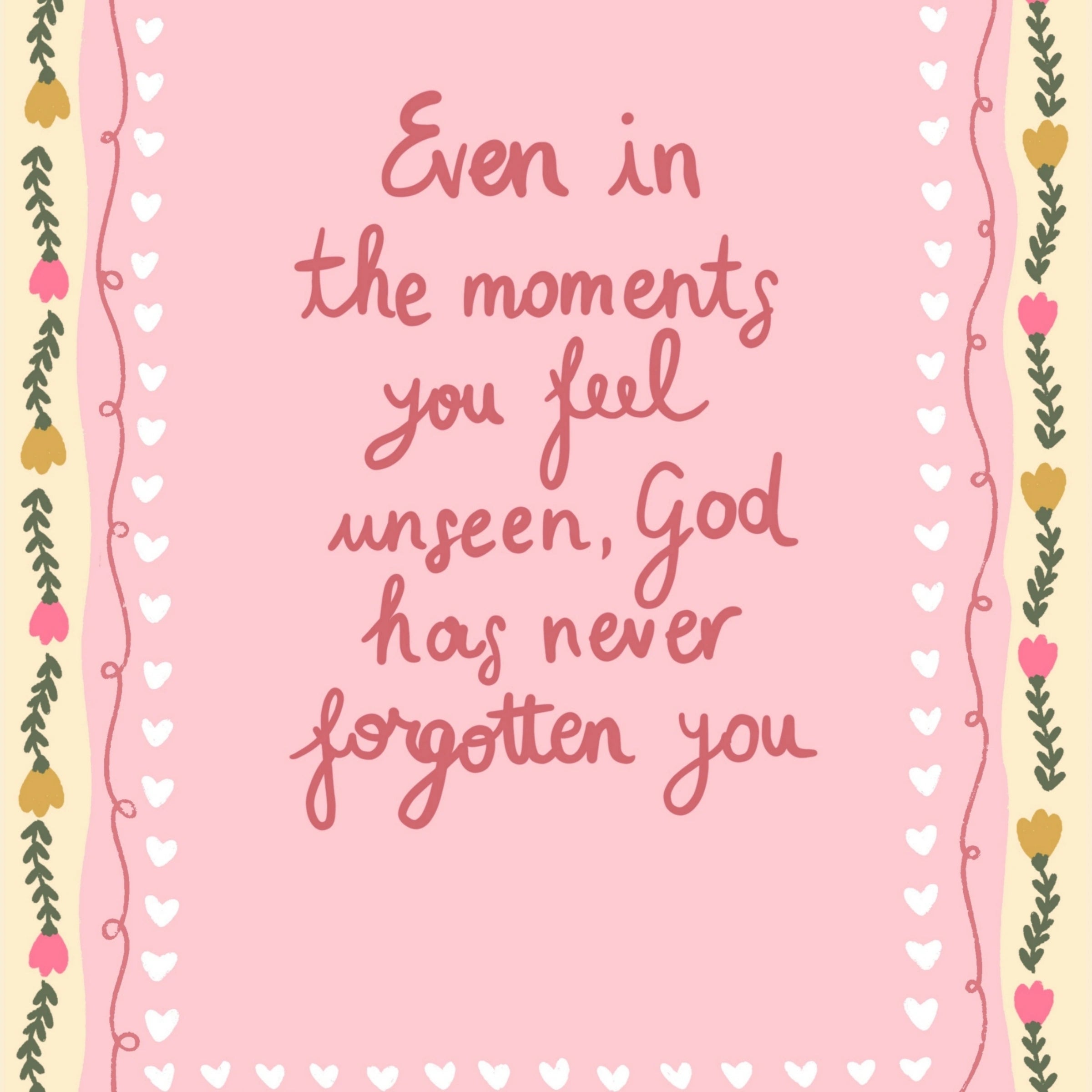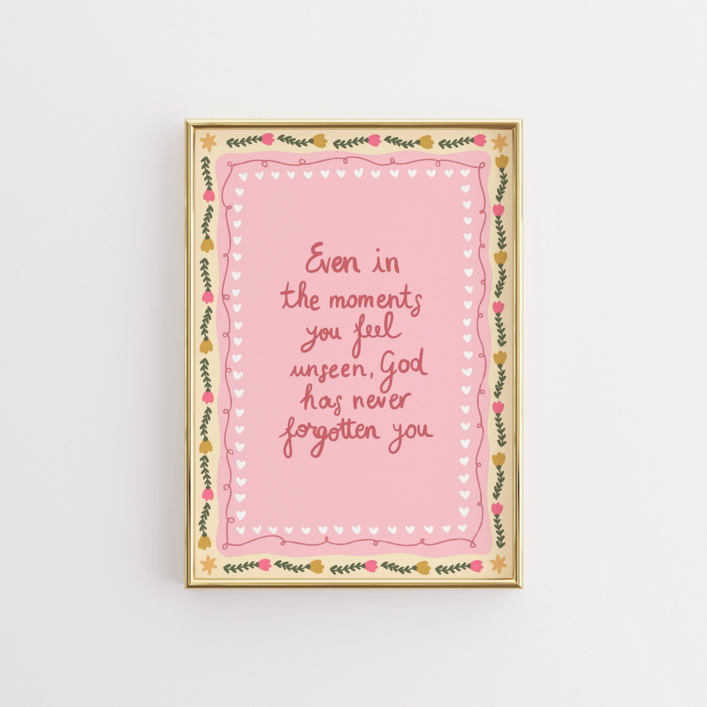 Transformez votre espace en un sanctuaire doux et empreint de foi grâce à nos illustrations murales chrétiennes réalisées à la main, dans un style printanier délicat et coquet.