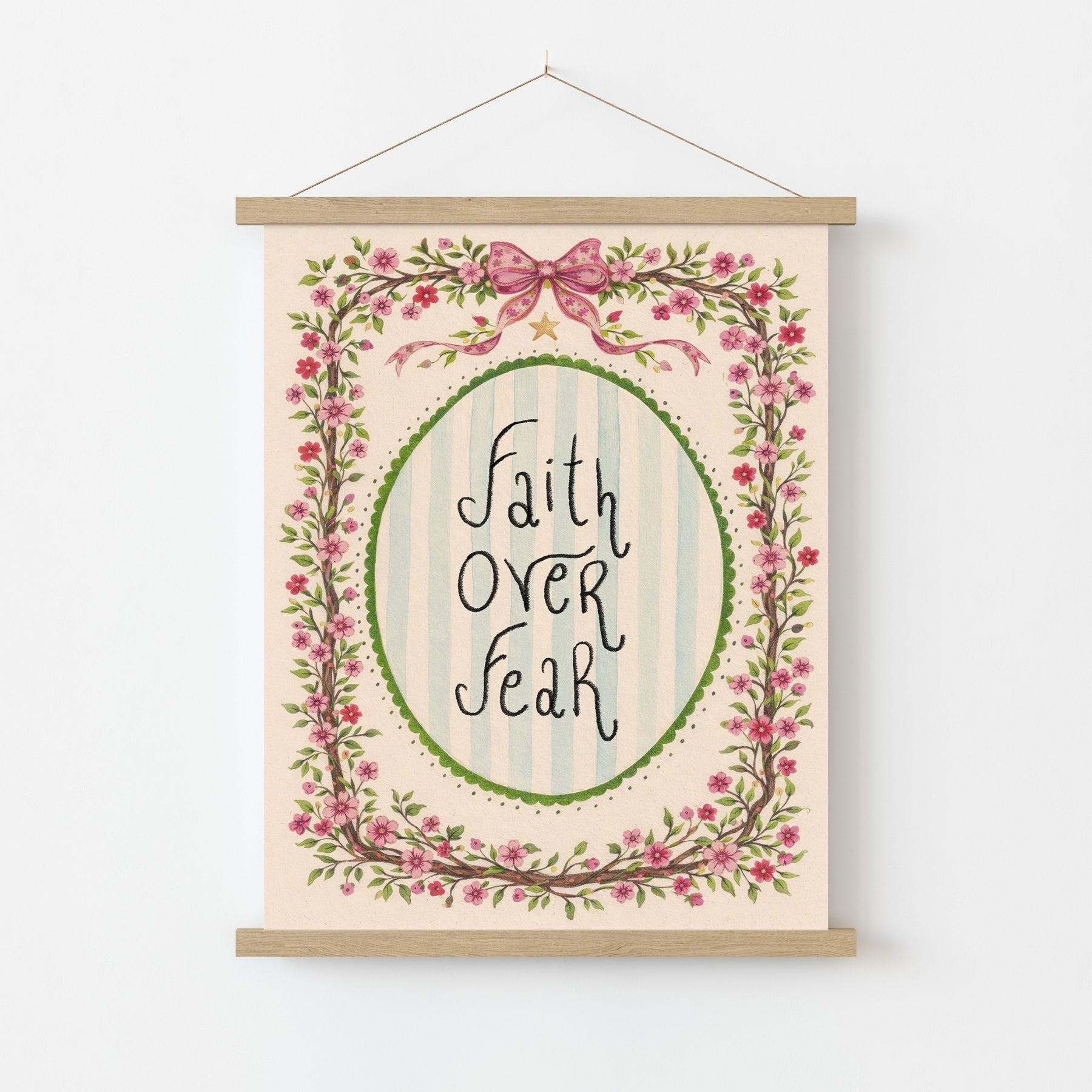 Stampato su carta semilucida di alta qualità da 200 g/m², per toni tenui ma vivaci e dettagli nitidi. Fornito con un gancio magnetico in legno minimalista, disponibile nelle finiture naturale, bianco o nero. Leggero, moderno e pronto da appendere all'istante, senza bisogno di cornice.