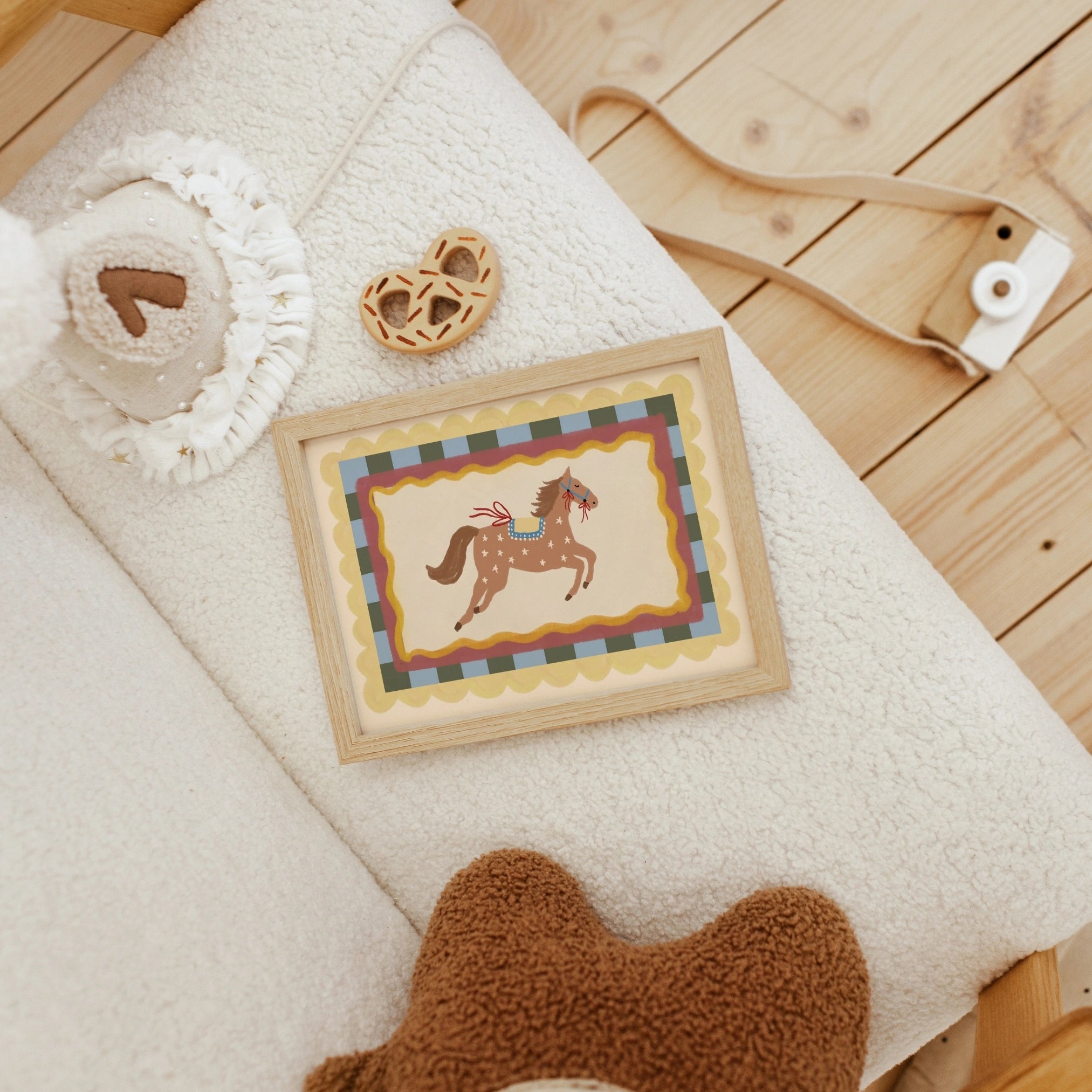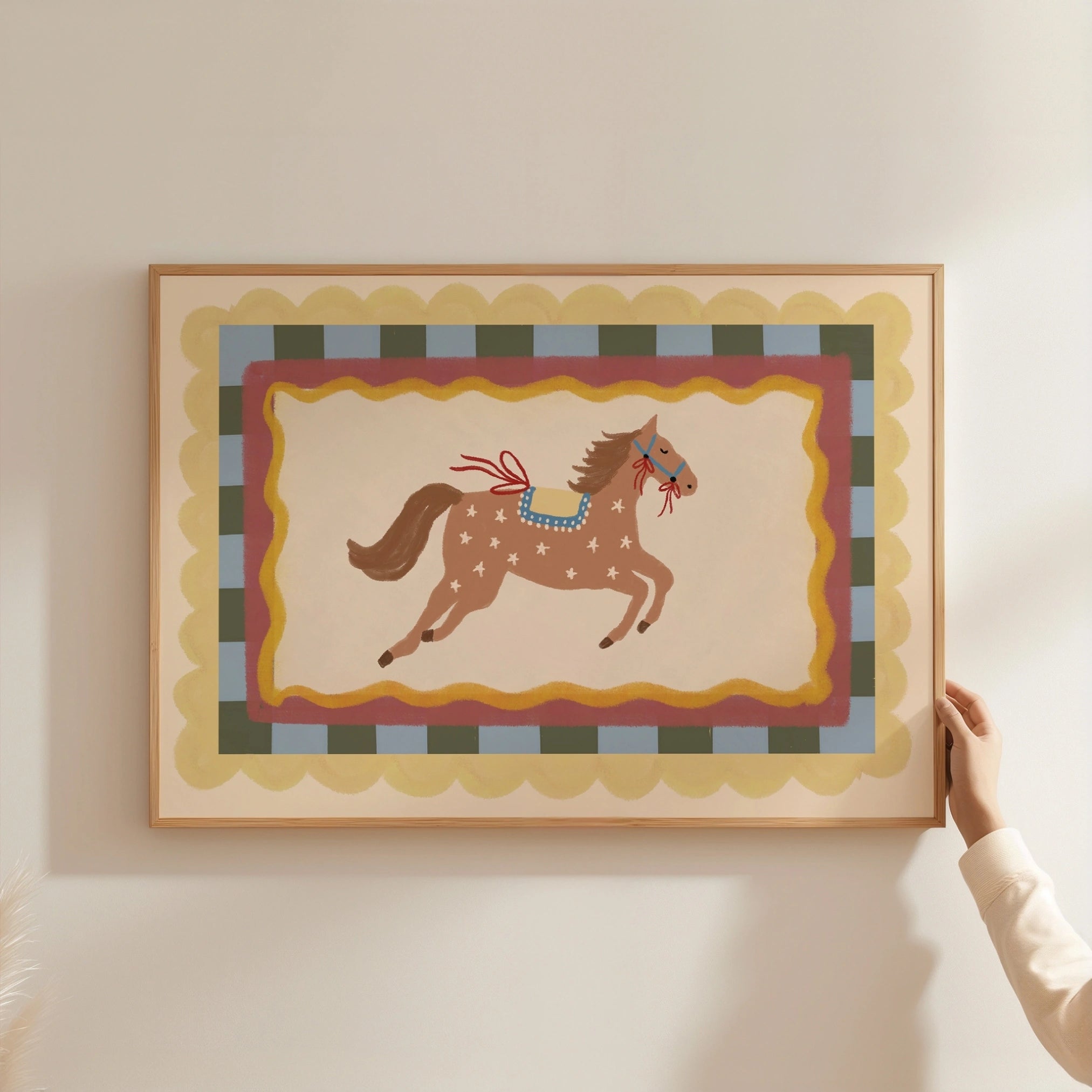 Stampato su carta semilucida di alta qualità da 200 g/m², per toni tenui ma vivaci e dettagli nitidi. Fornito con un gancio magnetico in legno minimalista, disponibile nelle finiture naturale, bianco o nero. Leggero, moderno e pronto da appendere all'istante, senza bisogno di cornice.