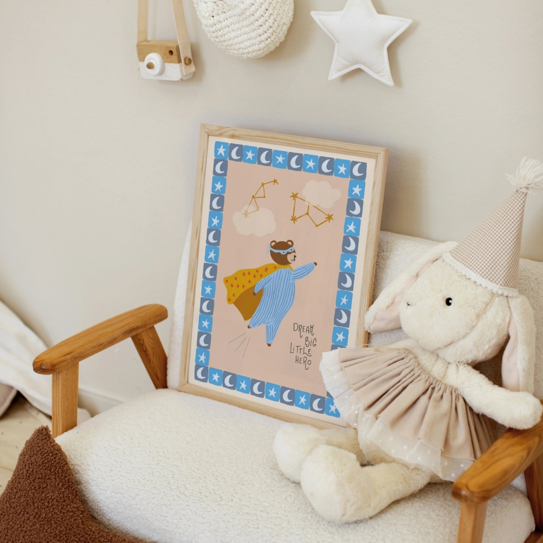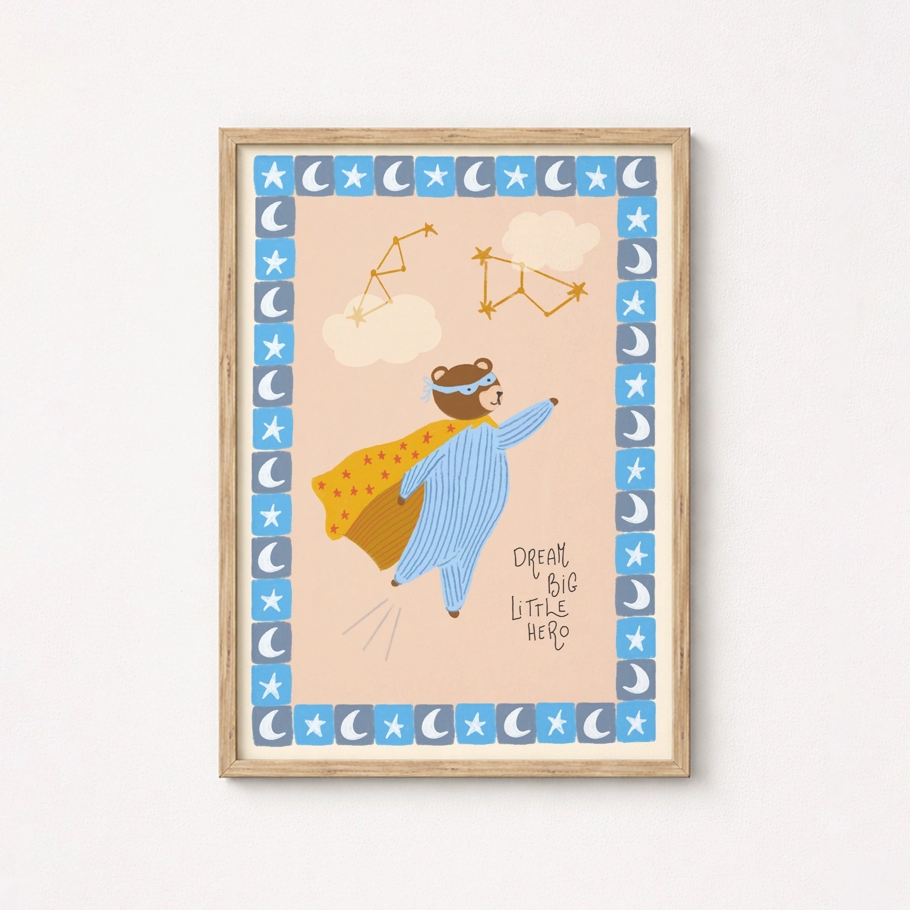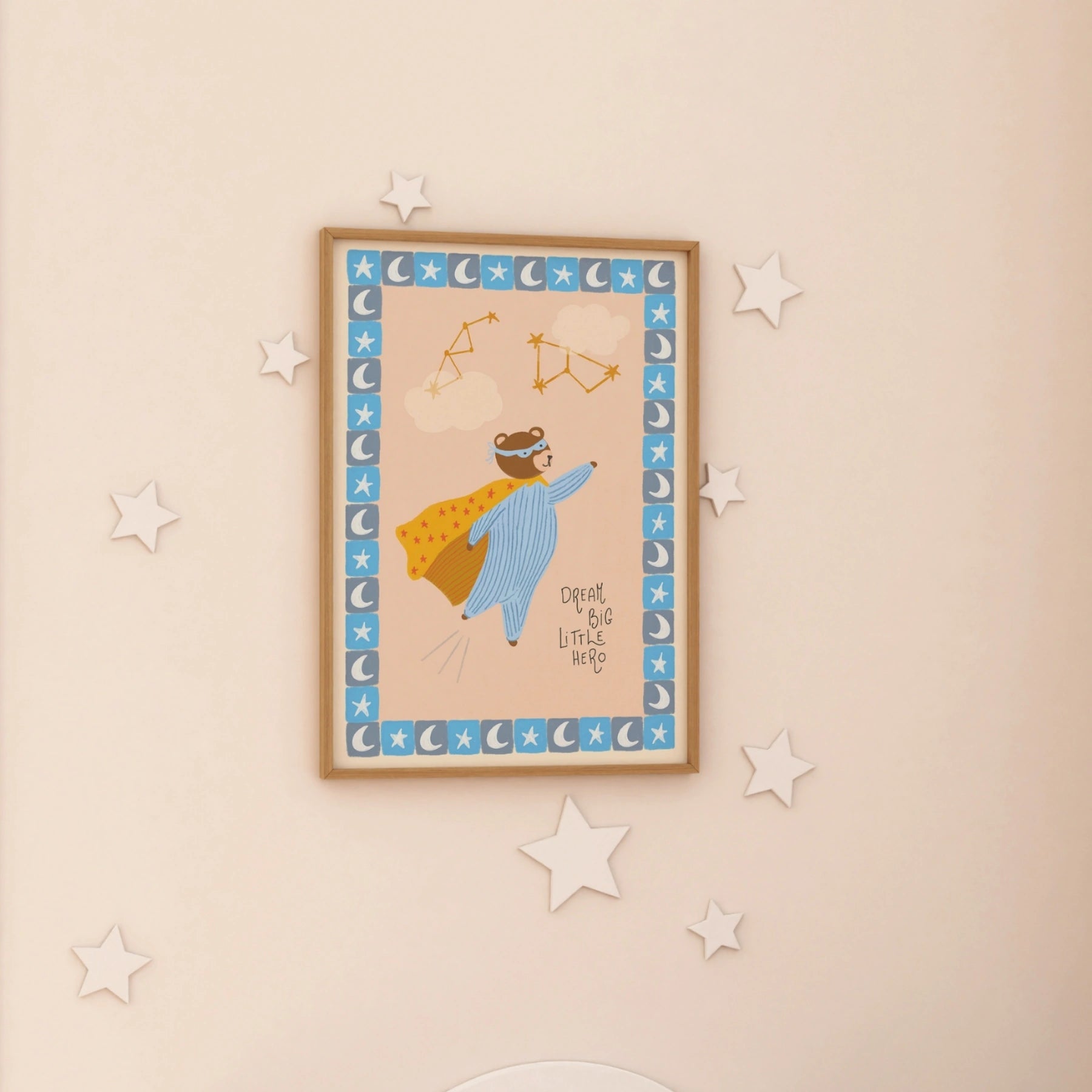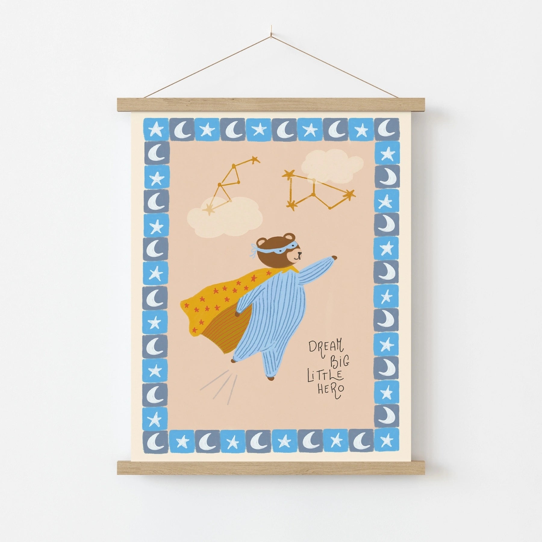 Stampato su carta semilucida di alta qualità da 200 g/m², per toni tenui ma vivaci e dettagli nitidi. Fornito con un gancio magnetico in legno minimalista, disponibile nelle finiture naturale, bianco o nero. Leggero, moderno e pronto da appendere all'istante, senza bisogno di cornice.