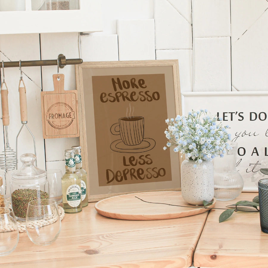 Witziges Kaffee-Wandbild – Spruch „Mehr Espresso, weniger Depression“