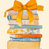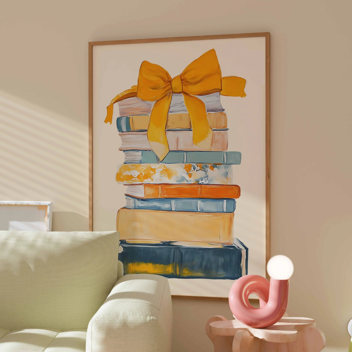 Bücherstapel mit orangefarbener Schleife – Farbenfrohe Wanddekoration für Bücherliebhaber