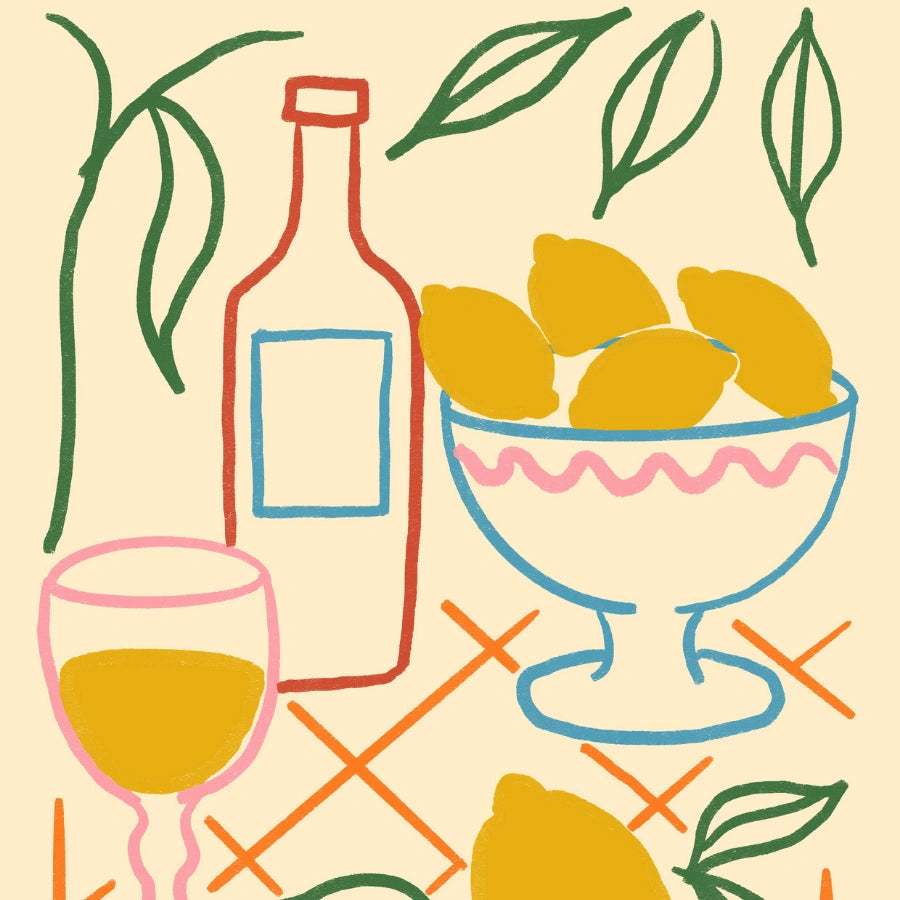 Natura morta con limone, arte murale boho – scena di tavolo mediterraneo