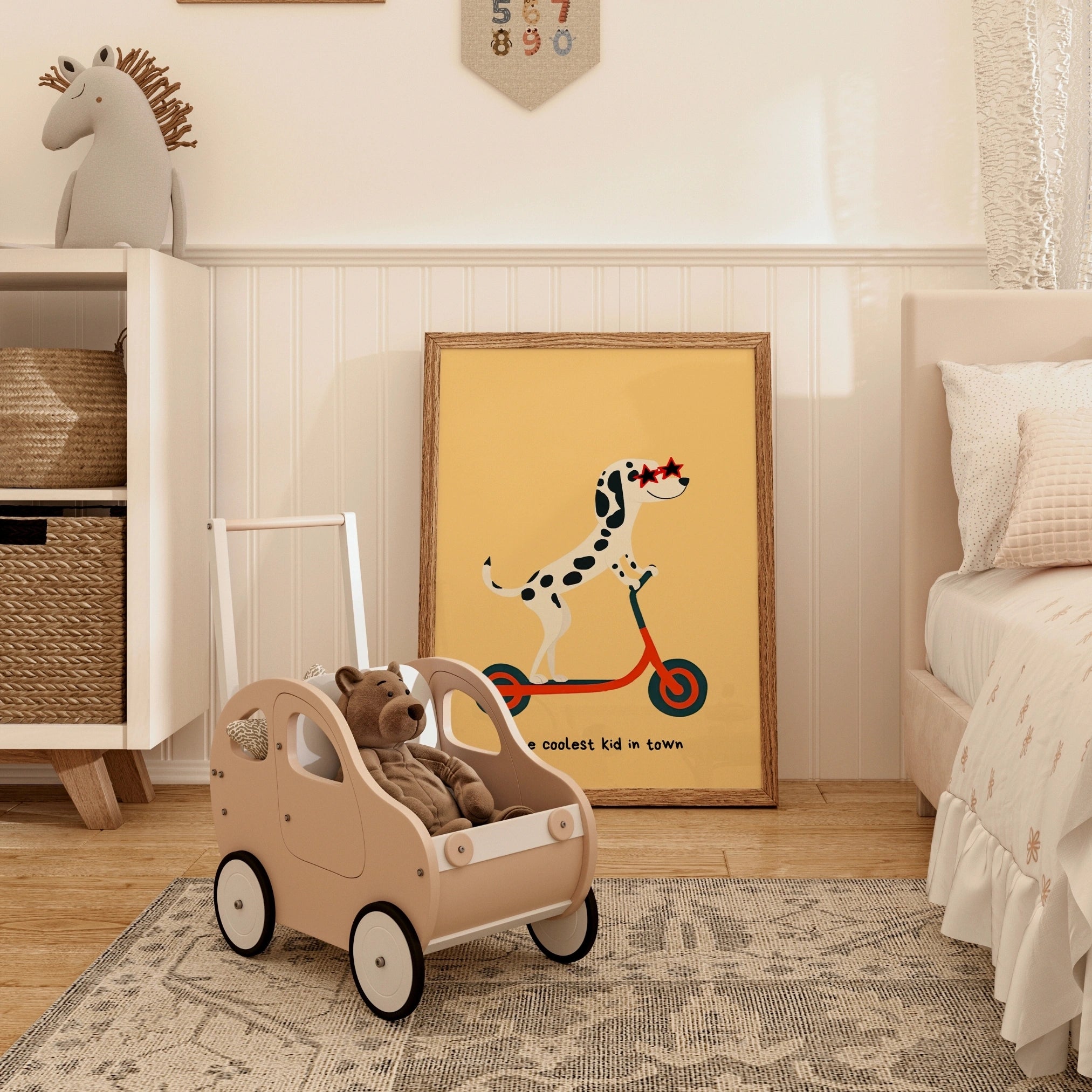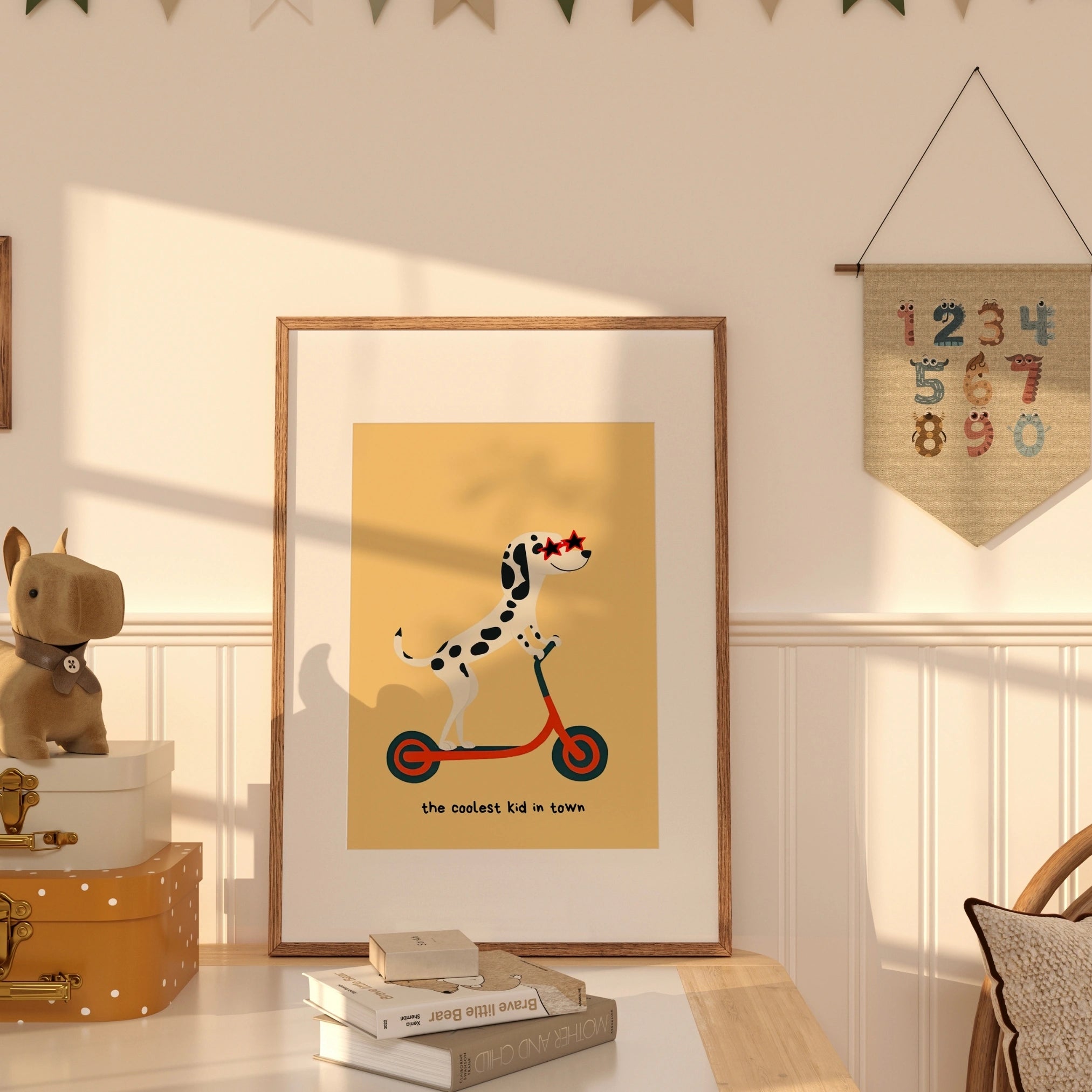 Stampa del ragazzo più cool della città, dalmata – Divertente arte murale con cane e scooter
