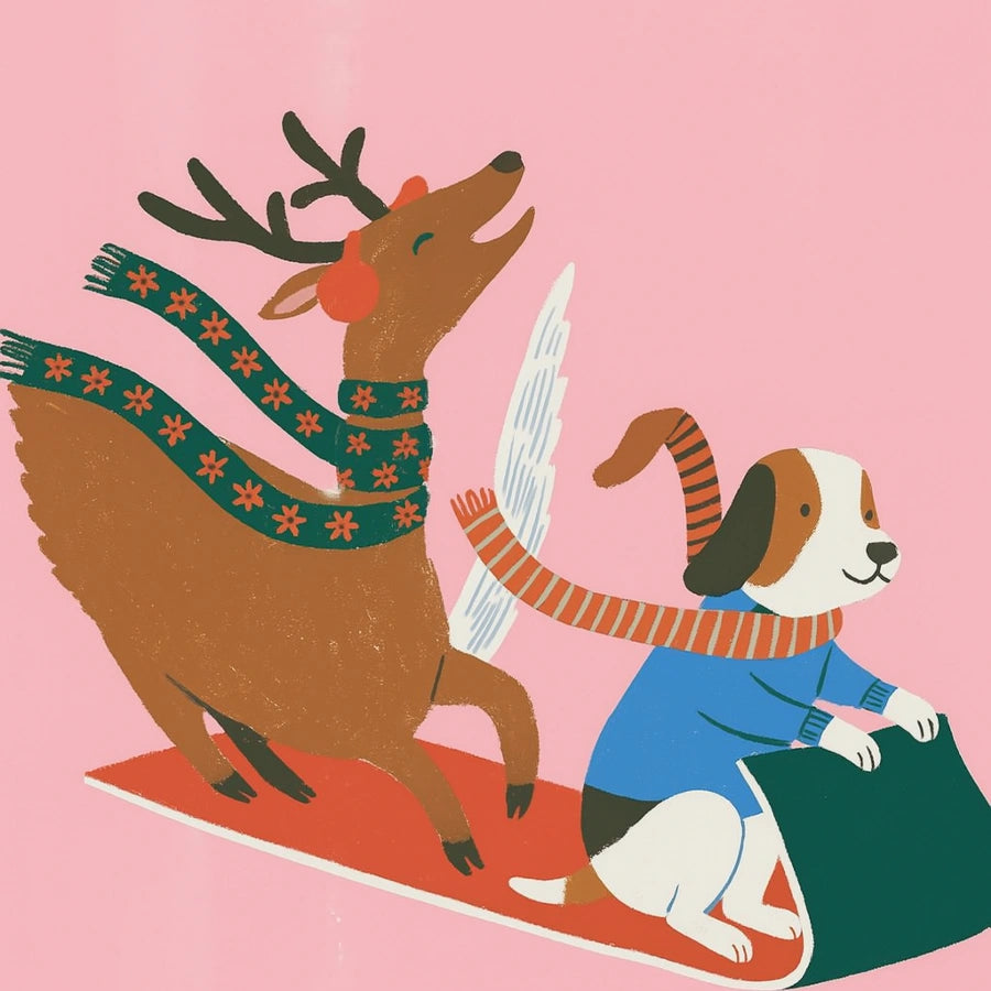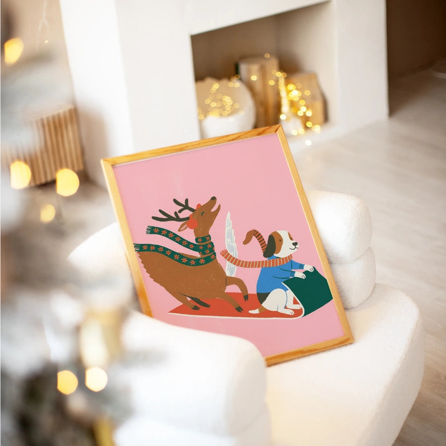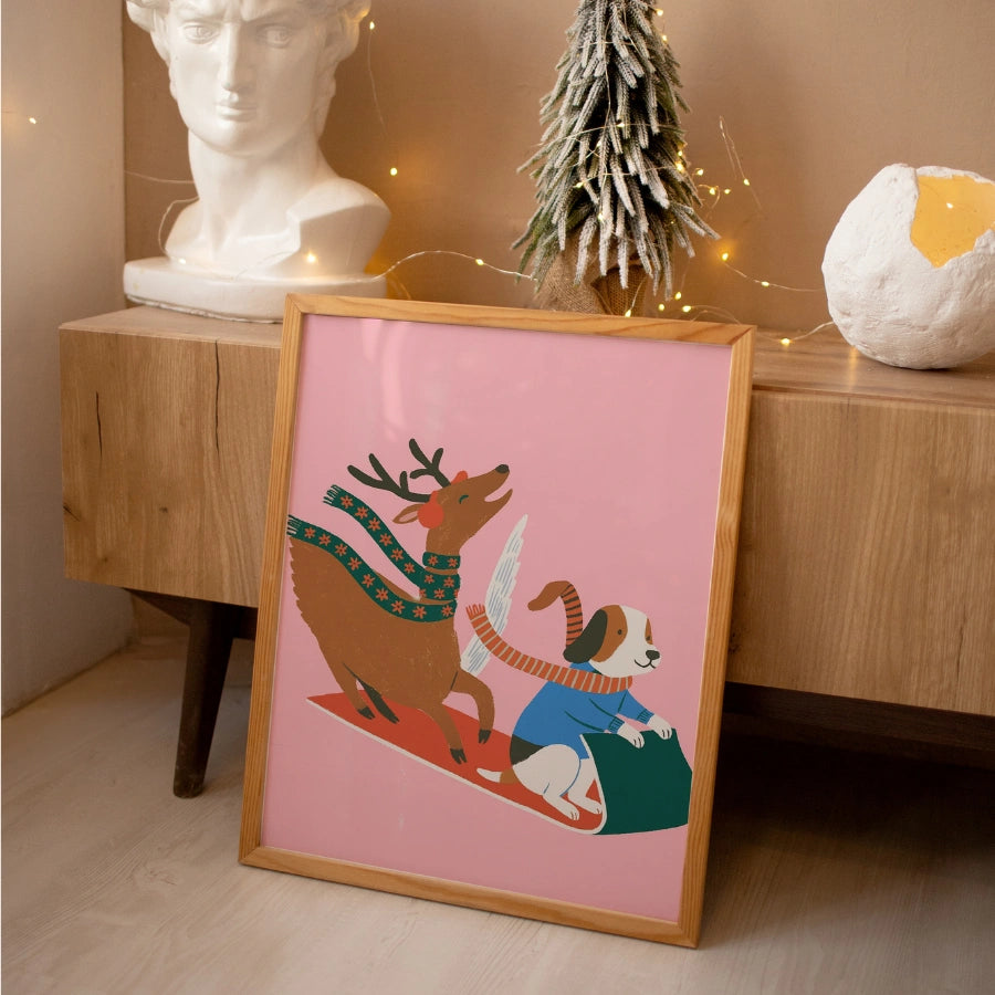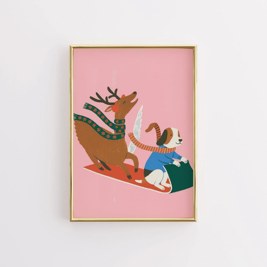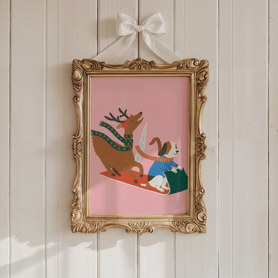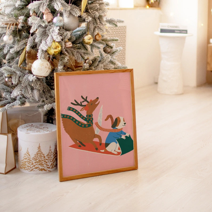 Giro in slitta con cani volanti e renne – Graziosa decorazione murale natalizia rosa