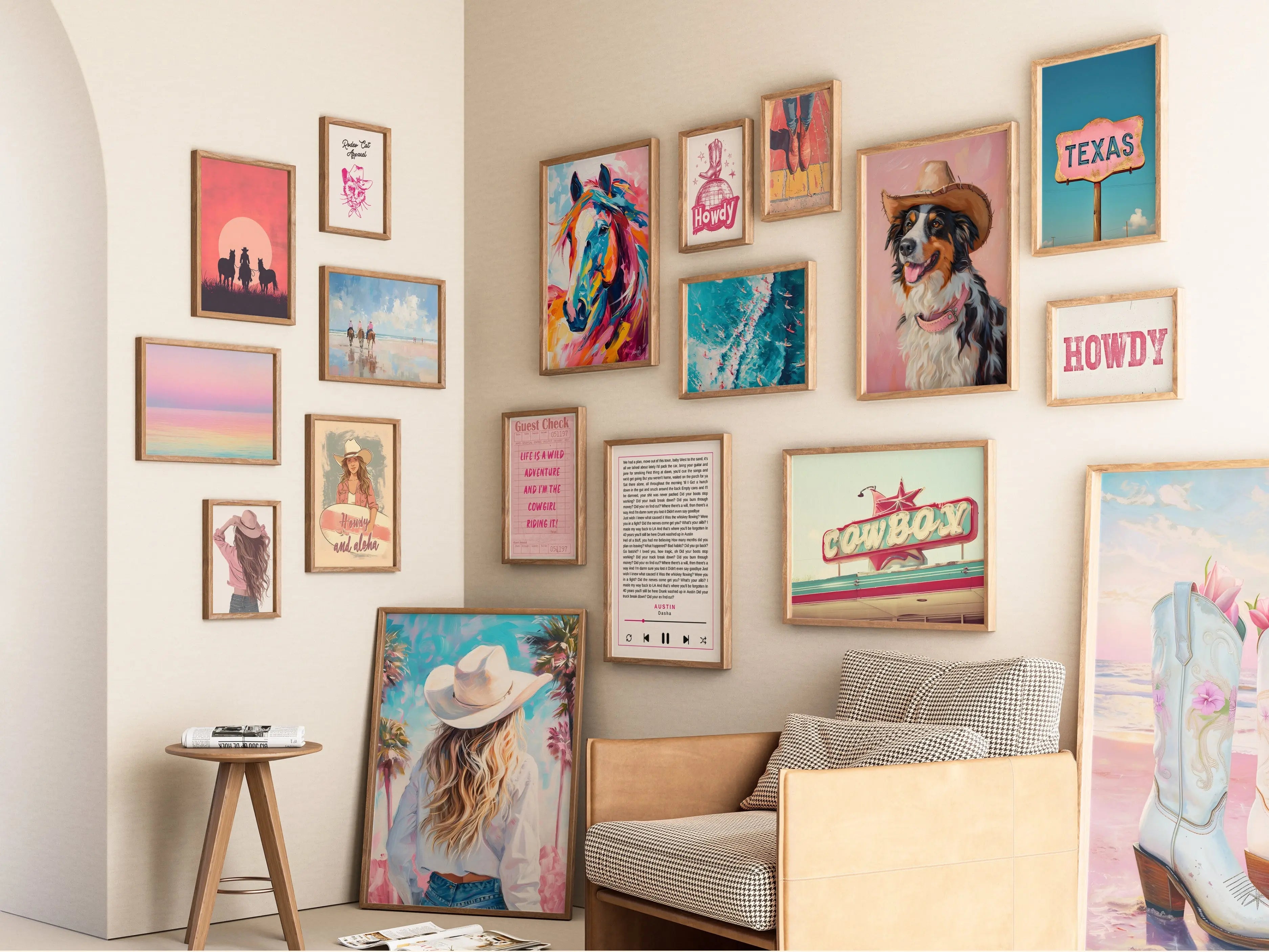 Bold, feminine, and unapologetically Western — the Maximalist Cowgirl Collection features over 220 digital prints filled with pink tones, cowboy boots, and desert vibes. Perfect for statement walls that blend glamour and freedom.