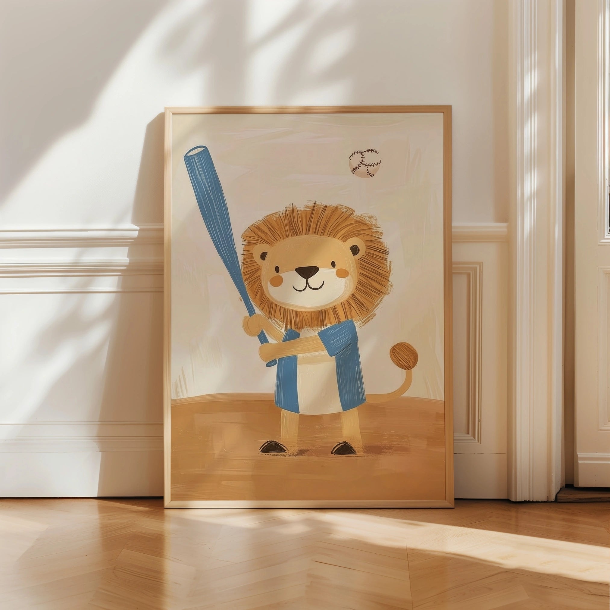 Baseball Lion Wall Art – Sports Animal Print for Boys Room