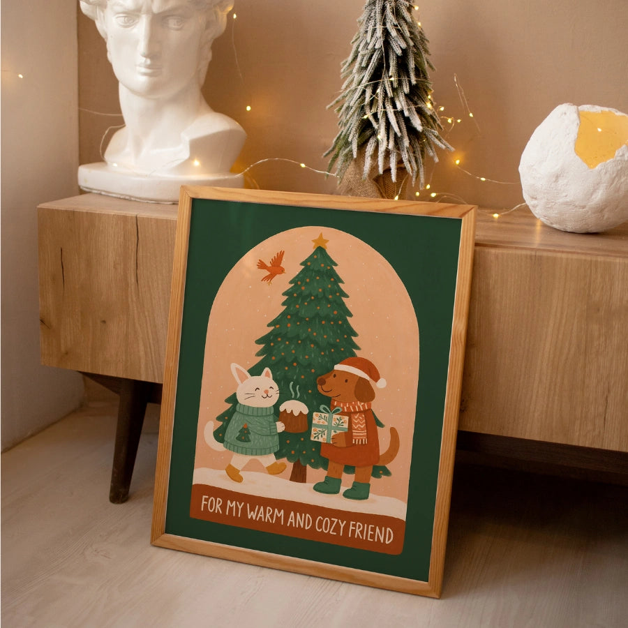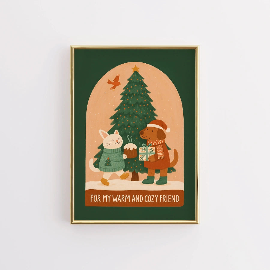 Dog and Cat Cozy Friendship – Cute Animal Christmas Print