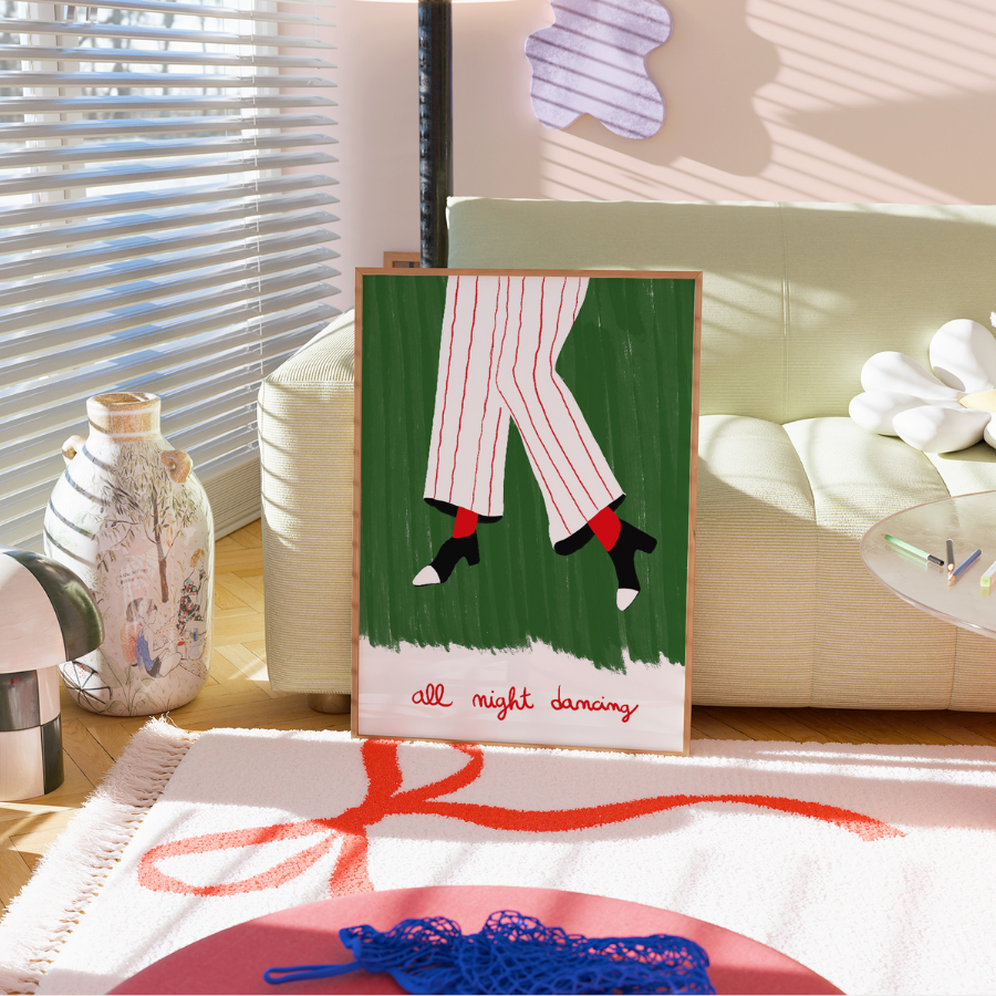 Each artwork is filled with bold tones, playful details, and distinctive character, designed on iPad and printed on premium materials that brighten any space with lasting quality and charm.