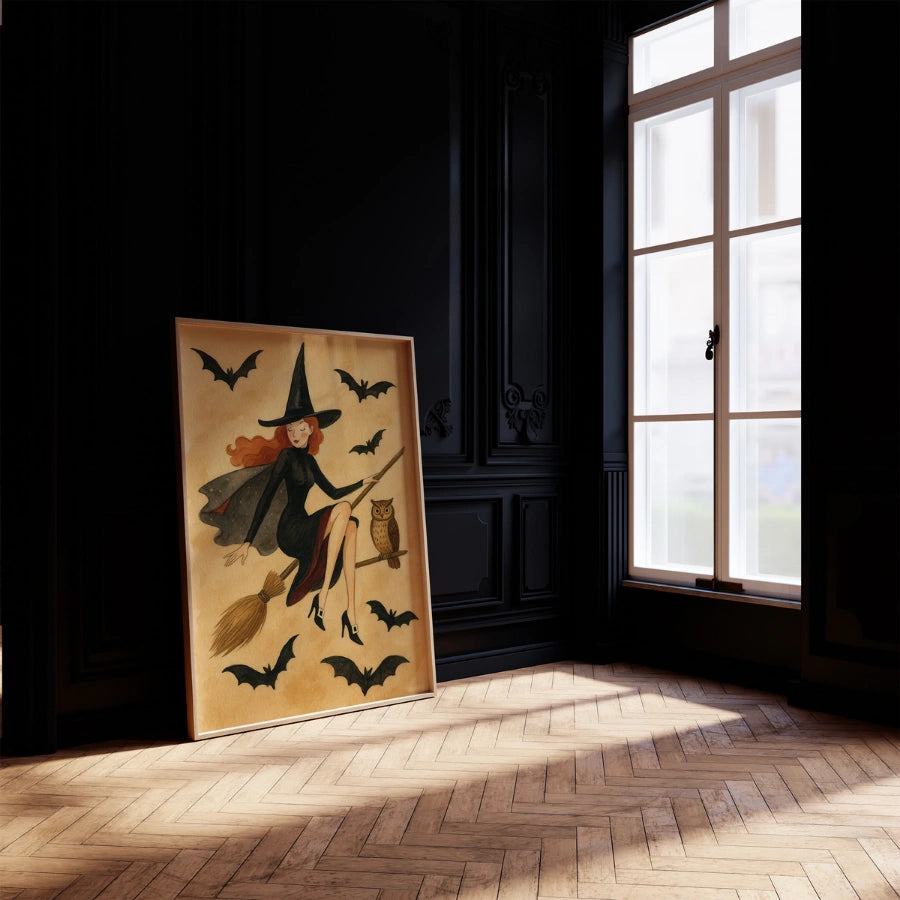 Elegant Witch Halloween Print – Vintage Flying Witch Wall Art