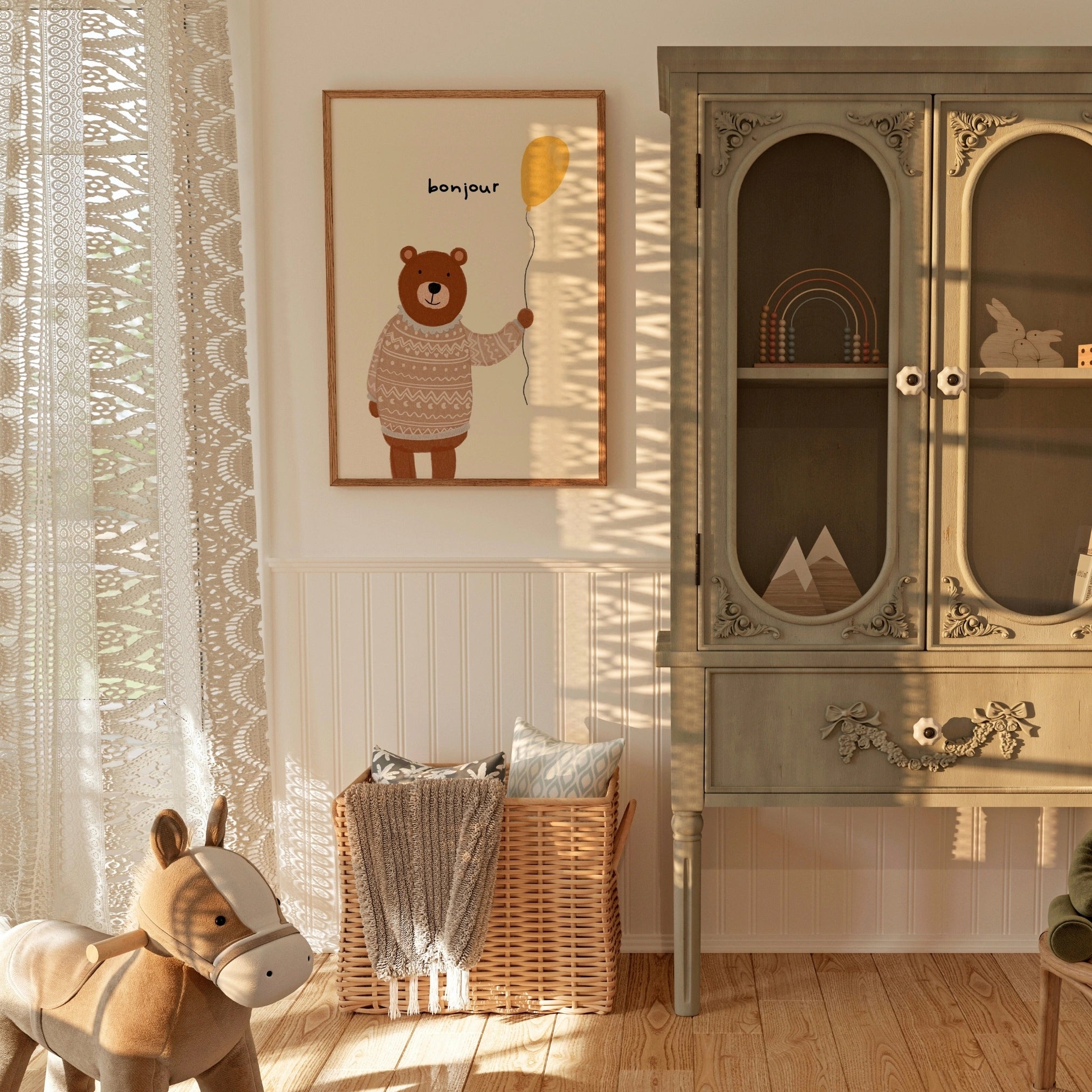 Bonjour Bear Wall Art – Cute Nursery Print with Sweater and Balloon
